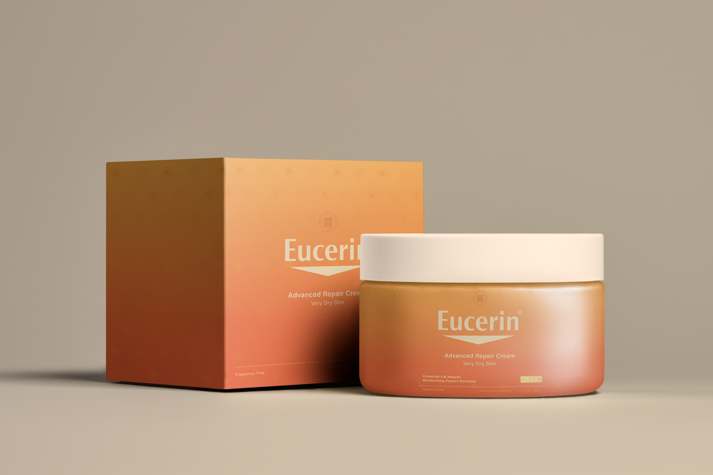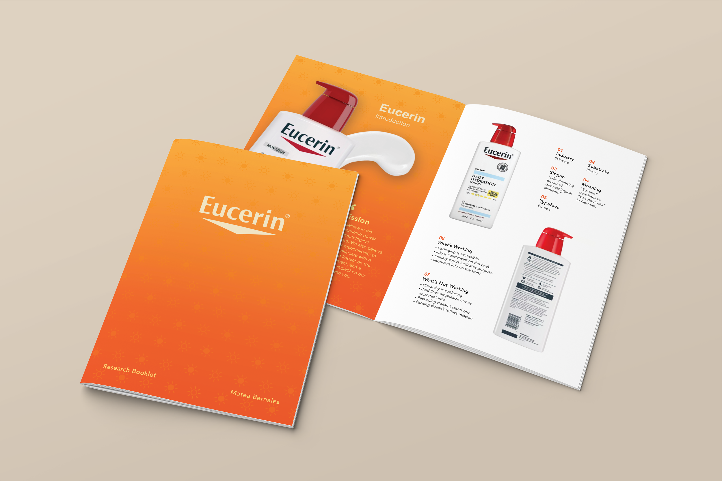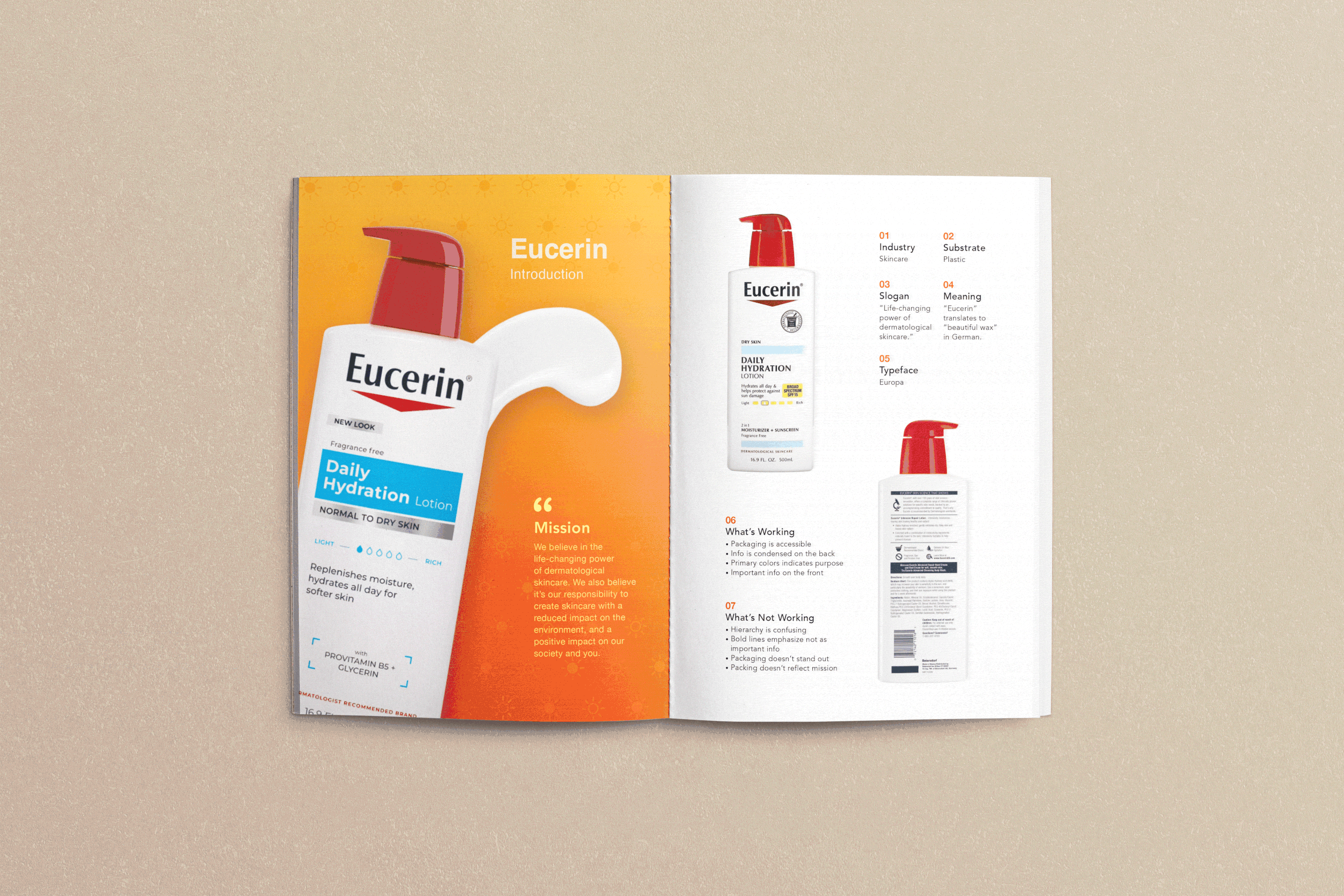 Package redesign for Eucerin skincare products. This portfolio features collateral, box packaging, and research book design.